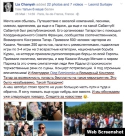 Однако оказалось, что на Сабантуй в Париж поехали не только такие вот активисты, но даже и люди, просто не имеющие никакого отношения ни к татарам, ни к Татарстану. Теперь эти "татары на час" у себя в Facebook благодарят Конгресс за предоставленную возможность скататься в Париж и пишут о том, что надеются на то, что подобные "халявные" поездки будут организованы и впредь.