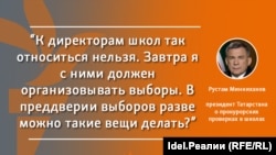 - "К директорам школ так относиться нельзя. Завтра я с ними должен организовывать выборы. Или это специально так делается, чтобы в Татарстане было плохо по отношению к нашему президенту Владимиру Путину?".