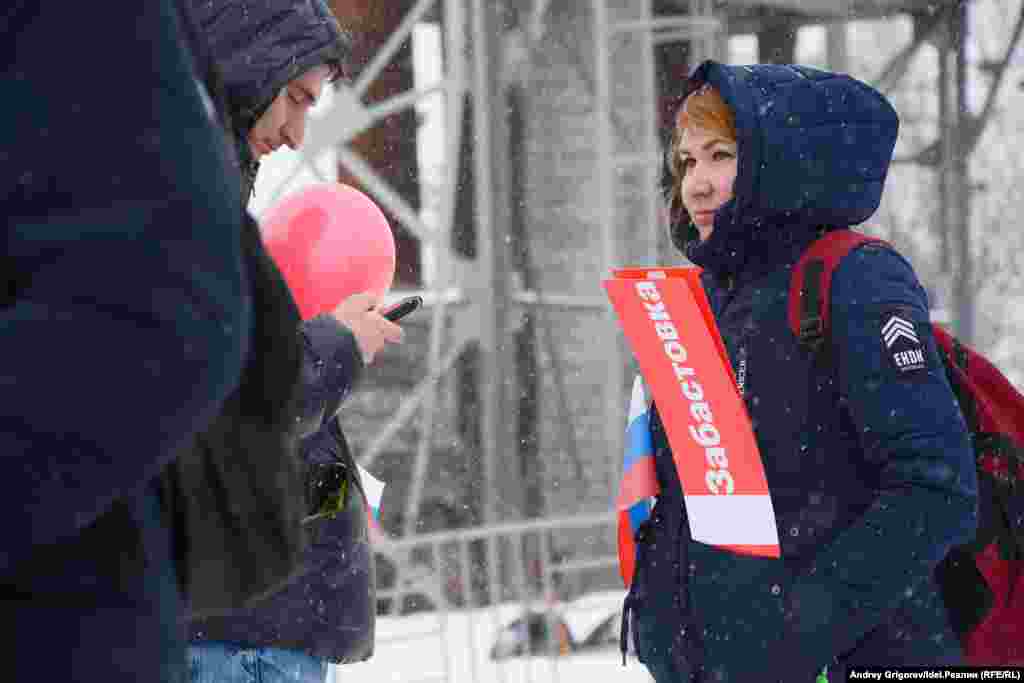 Протестующие держали в руках флаги России, красные воздушные шары, таблички со словом "забастовка", плакаты "18 марта выбираю забастовку", "Мне стыдно голосовать", "Сам не иду и вам не советую!", "Мне некого выбирать!"