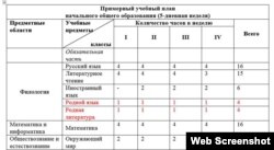 В 1-4 классах для предмета "родной язык" отведен один урок в неделю, еще один урок отводится предмету "родная литература". В то же время русскому языку отводится четыре часа, литературному чтению (русской литературе) предоставляется также четыре часа в неделю (в четвертом классе — три часа в неделю). Иностранный язык вводится со второго класса в количестве двух часов в неделю.