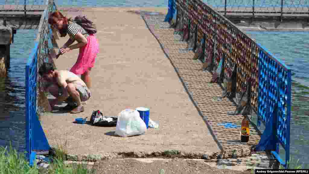 Местные жители принесли скребки, кисти и краски. Остатки ржавчины и старой краски отскабливали, поверх — наносили новую, синюю. Двумя неделями раньше, напомним, люди привели в порядок обмелевший берег под пирсом. Мусора тогда набралось на две грузовые "Газели". Все эти старания, впрочем, могут пойти прахом. Властям города и района не нужен парк на этом месте. Уже найден застройщик территории, который, как подозревают активисты, оставит от рощи с парком одну жалкую аллею.