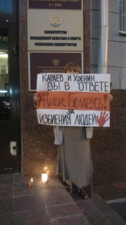 Уфимский активист Камиль Чураев сегодня более часа простоял в одиночном пикете у отделения посольства Беларуси в Уфе на улице Советской. В руках активист, сочувствующий протестующим в Минске и других белорусских городах, держал плакат с лозунгом "Жыве, Беларусь!"