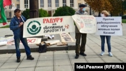 "МСЗ — это оранжевый дождь диоксины и фураны на Казань", Долой радоновый могильник около Крутушки. Радиация уже в Голубых озерах", "Долой технологию мобильной связи 5G", "Против радиационного облучения иловых полей Казани" — с такими плакатами вышли активисты.