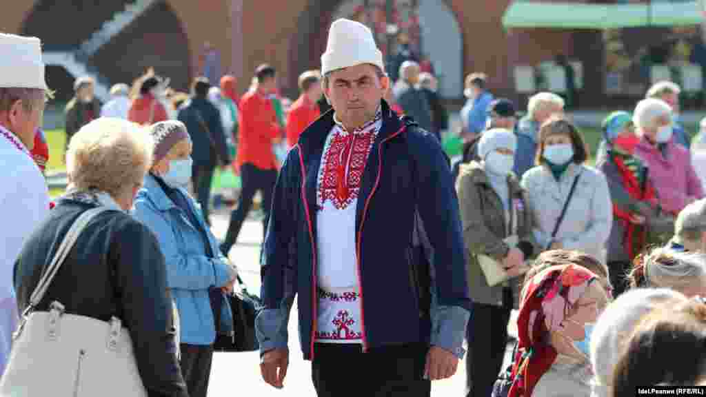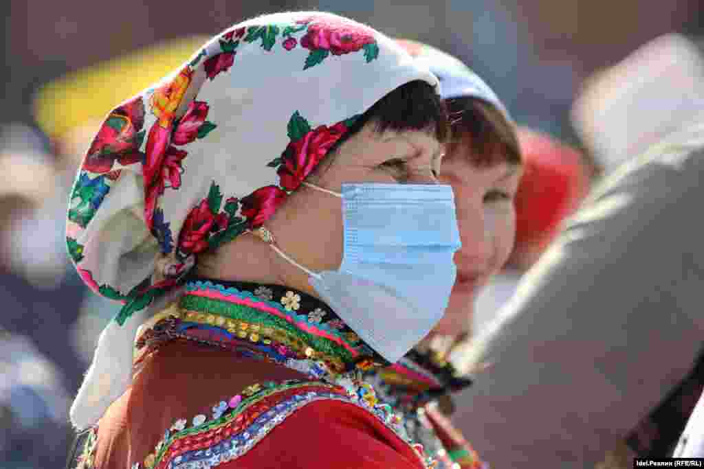 Организаторы "Пеледыш Пайрем" выдавали всем посетителям кремля одноразовые маски, обрабатывали руки входящих антисептиком. Вероятно, большая часть зрителей была в масках.