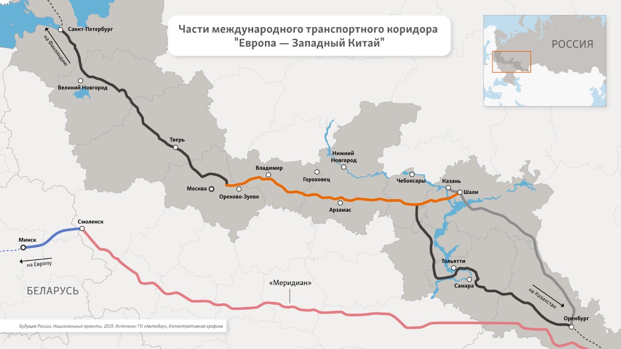 В международный транспортный коридор “Европа — Западный Китай” входят дорога М11 “Нева”, Центральная кольцевая автомобильная дорога (ЦКАД; первая построена, вторая — в процессе), трасса М12 Москва — Казань (проектируется) и обход Тольятти с мостом через Волгу (строится). Последние две должны быть введены в эксплуатацию в 2024 г.