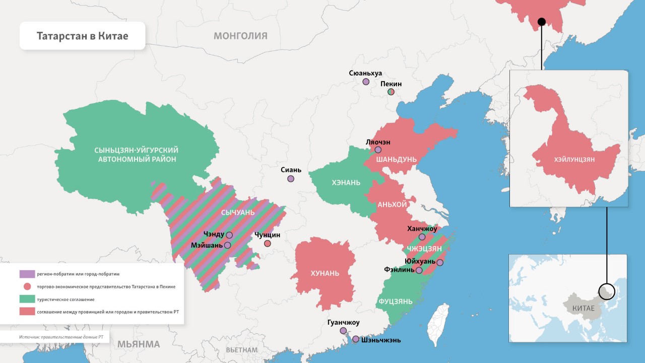 Минниханов в 2015 г. подписал соглашение с провинцией Сычуань, в том же году были достигнуты соглашения в области туризма с провинциями Хэнань и Сычуань, Сыньцзян-Уйгурским автономным районом и Пекином. У Татарстана установились особые связи с одной из провинцией — Сычуань. Между ними не просто подписываются соглашения, регионы с 2016 г. — побратимы. А с 2015 г. Казань и Чэнду (столица региона) подписали меморандум об установлении дружественного сотрудничества.