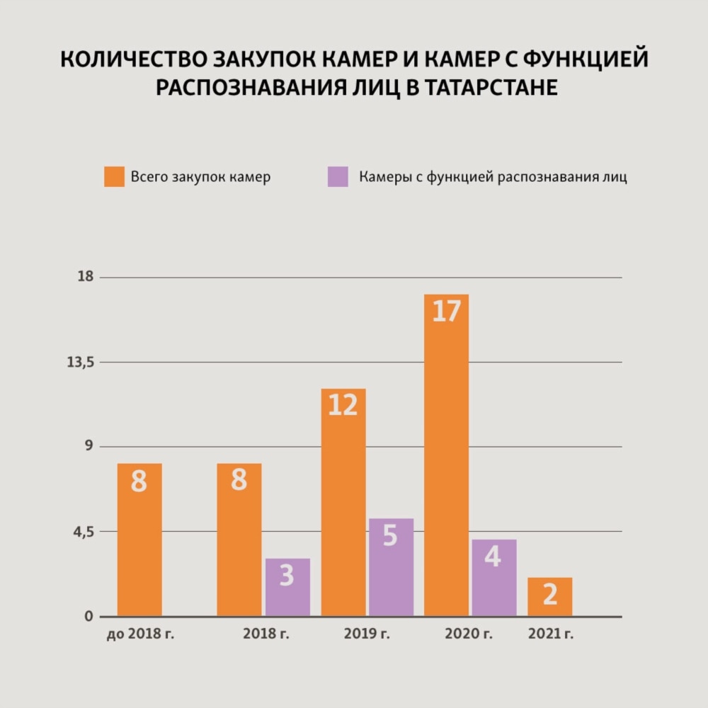 “Idel.Реалии” удалось обнаружить 17 закупок, договоров и контрактов, связанных с видеонаблюдением в 2020 г. И это абсолютный рекорд по такого рода “покупкам”. Интересно еще и то, что это рекорд в том числе и по финансированию на устройства с функцией распознавания лиц.