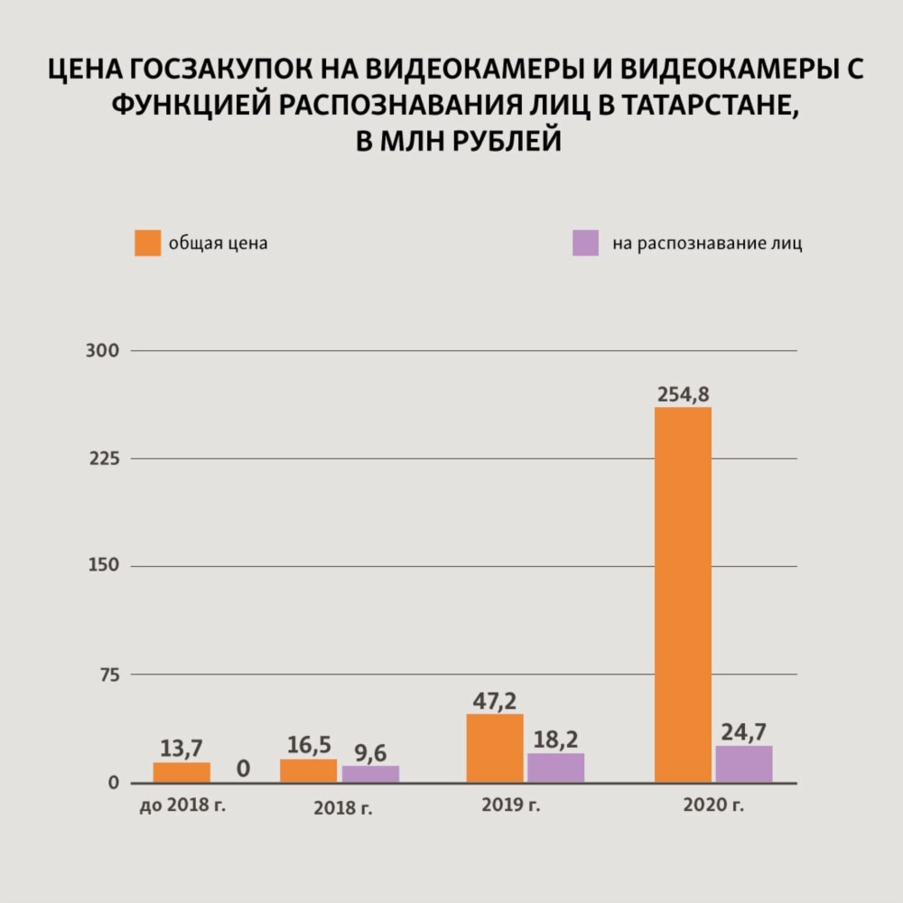 В том же году Минцифры РТ провело две закупки по 350 тысяч рублей на оказание услуг по организации видеонаблюдения с функцией распознавания лиц и биометрической идентификации по фотоизображению лица человека на территории Республики Татарстан.