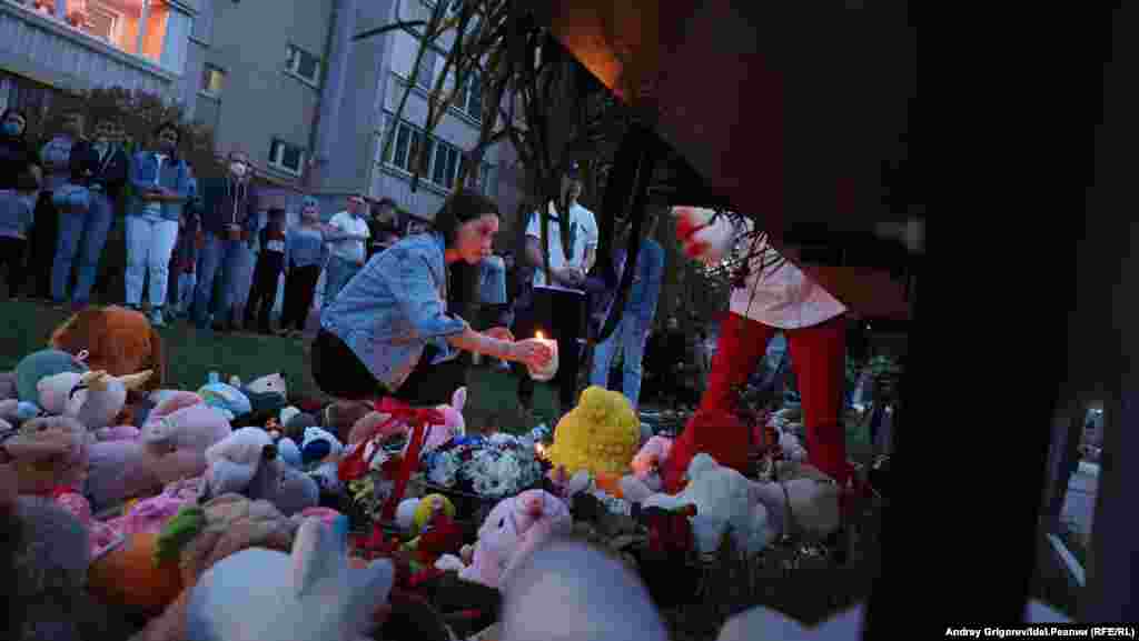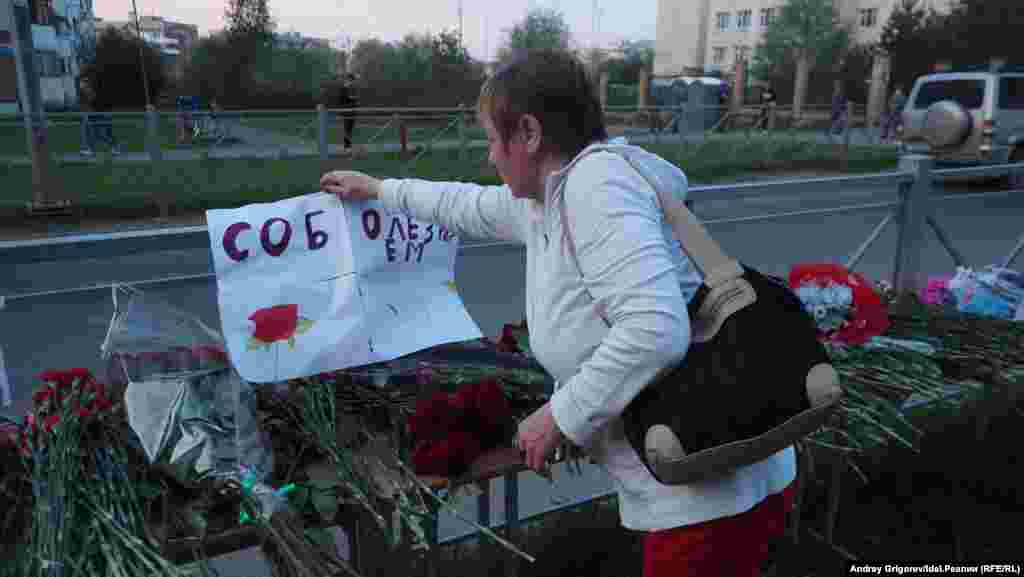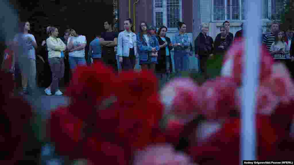 Казанцы до поздней ночи несли цветы, мягкие игрушки и свечи к школе, которая 11 мая подверглась атаке вооруженного ружьём 19-летнего парня. Уже в восемь вечера импровизированный мемориал утопал в цветах и плюшевых мишках. Он был организован на газоне наискосок от школы. К самому учебному заведению многочисленных казанцев не подпускала полиция.
