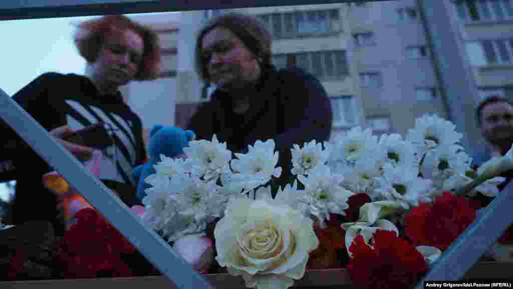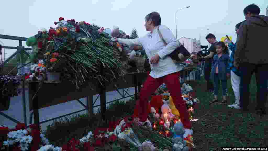 Казанцы до поздней ночи несли цветы, мягкие игрушки и свечи к школе, которая 11 мая подверглась атаке вооруженного ружьём 19-летнего парня. Уже в восемь вечера импровизированный мемориал утопал в цветах и плюшевых мишках. Он был организован на газоне наискосок от школы. К самому учебному заведению многочисленных казанцев не подпускала полиция.