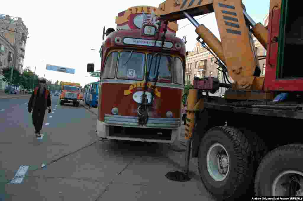Трамвай-трактир "Пятёрочка" сошёл с рельс и перекрыл проезжую часть на улице Декабристов у остановки Гагарина. Июнь 2007 года.