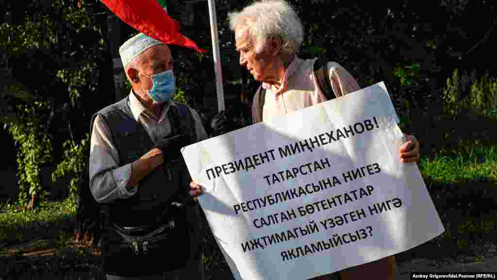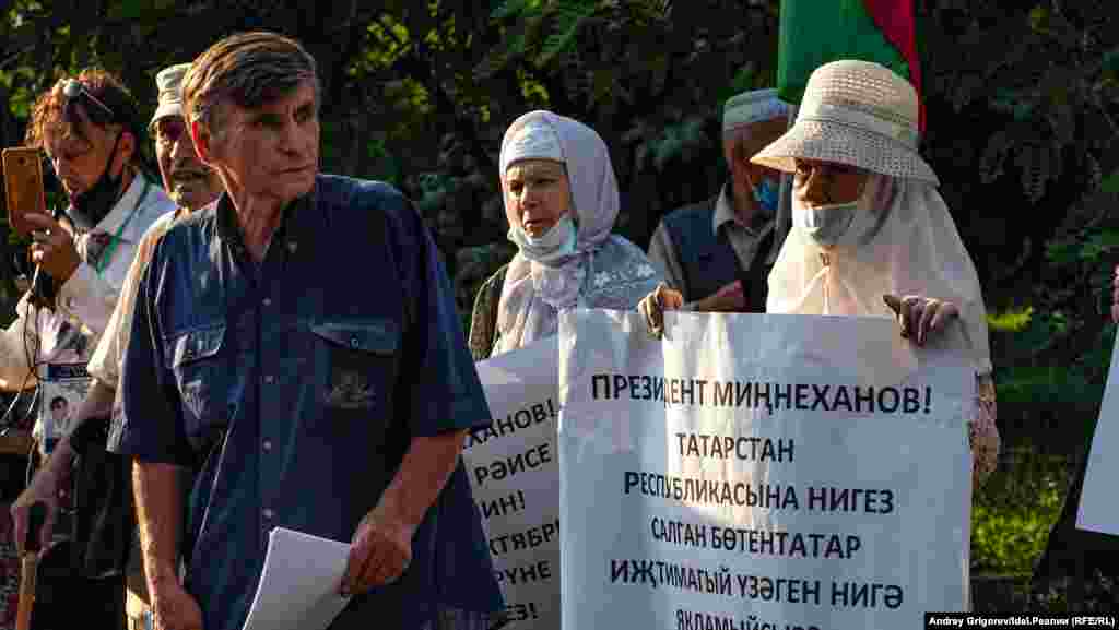 "Прокурор Нафиков! Требуем отказаться от позорного иска против ВТОЦ", гласила надпись на одном из плакатов. Еще на одном плакате была надпись "Татарстан: 2021 = 1937". Кроме того, активисты требовали от президента РТ Рустама Минниханова и председателя Госсовета Татарстана Фарида Мухаметшина признать 15 октября памятным днём (последние несколько лет власти в Татарстане под разными предлогами препятствуют проведению акций, посвященных этой дате).