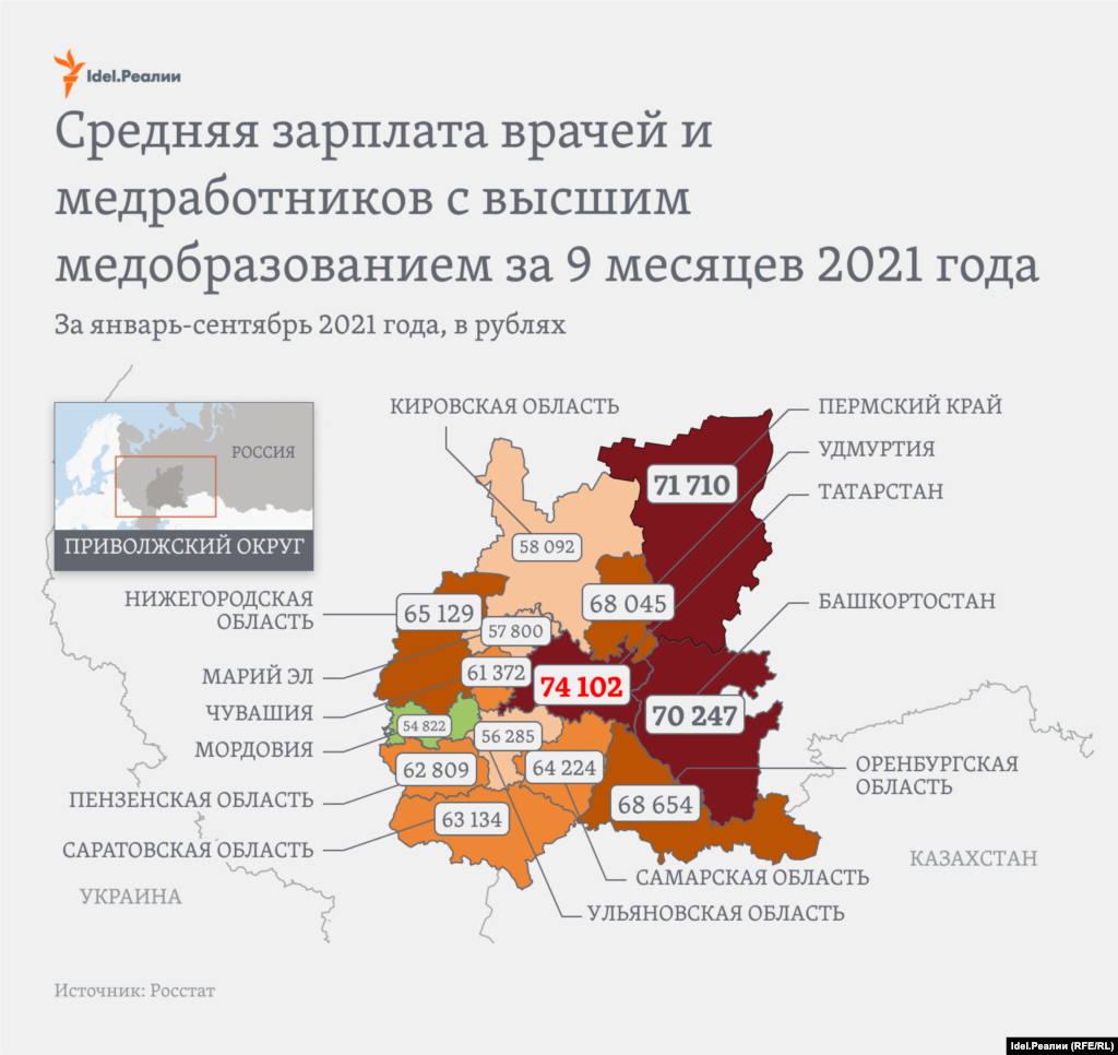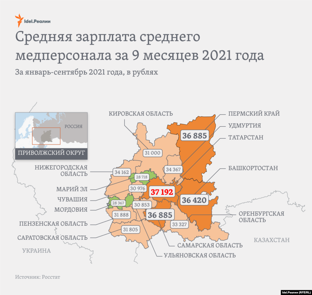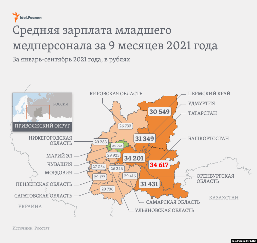 В лидерах по уровню заработной платы — Татарстан, Башкортостан и Пермский край. При этом доходы среднего и младшего медперсонала в два раза меньше доходов врачей и медицинских работников с высшим образованием.