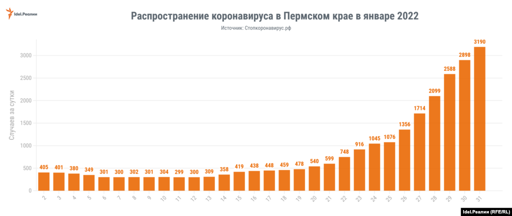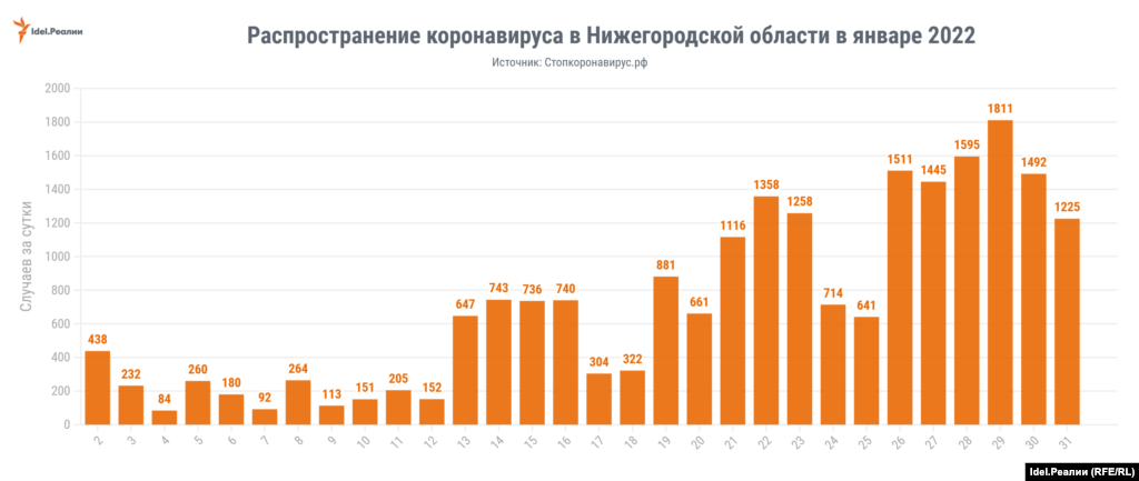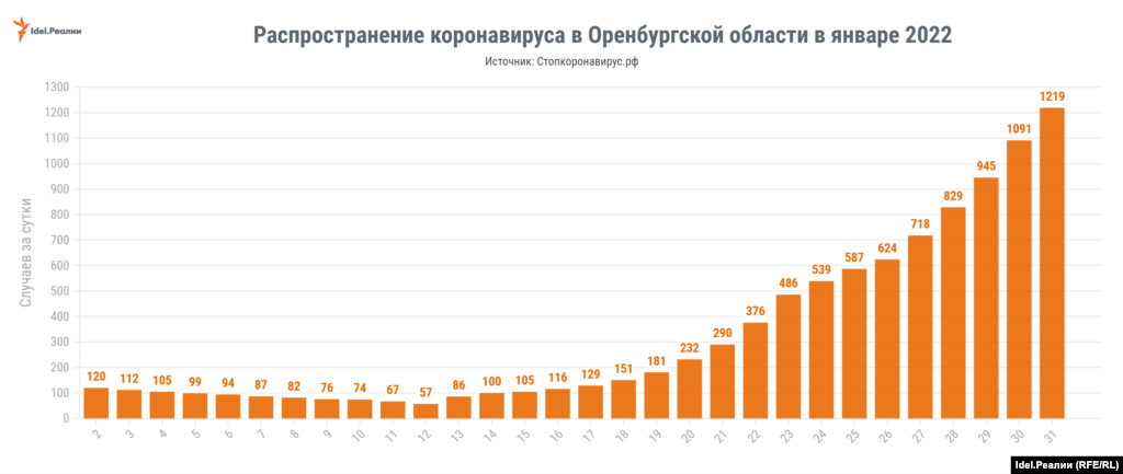 Самый большой рост суточных заражений за месяц показала Удмуртия. Если в начале января было 52 случая за сутки, в конце января — уже 1351. Рост в 26 раз. Следом идут Чувашия (рост в 13,2 раза) и Оренбургская область (в 10,2 раза).