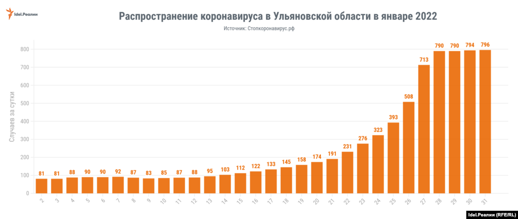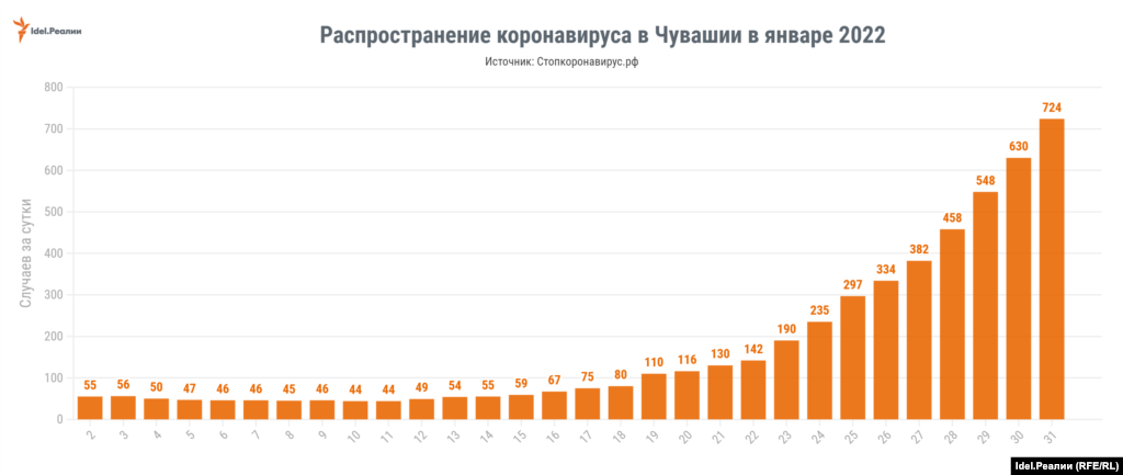 Самый большой рост суточных заражений за месяц показала Удмуртия. Если в начале января было 52 случая за сутки, в конце января — уже 1351. Рост в 26 раз. Следом идут Чувашия (рост в 13,2 раза) и Оренбургская область (в 10,2 раза).