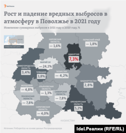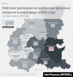Местные СМИ, ссылаясь на данные республиканского министерства природопользования и экологии, также отмечали, что Башкортостан стал лидером среди субъектов ПФО по загрязнению воздуха в городах. Львиную долю выбросов в Башкортостане дают северная промзона Уфы и предприятия, расположенные в южном промышленном узле республики — АО "Башкирская содовая компания", ГК "Таунефтехим", ООО "ХайдельбергЦемент Рус", ФКП "Авангард", АО "Газпром нефтехим Салават", ООО "Промводоканал", ООО "Ишимбайский специализированный химический завод катализаторов" и другие.