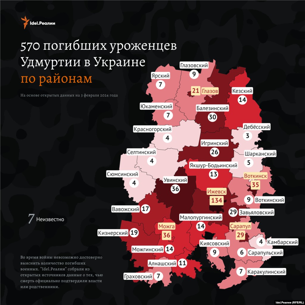Число погибших в действительности больше, мы руководствуемся лишь данными из открытых источников. По подсчетам "Idel.Реалии", с начала войны погибли 10 305 уроженцев и жителей Поволжья.