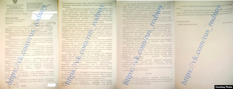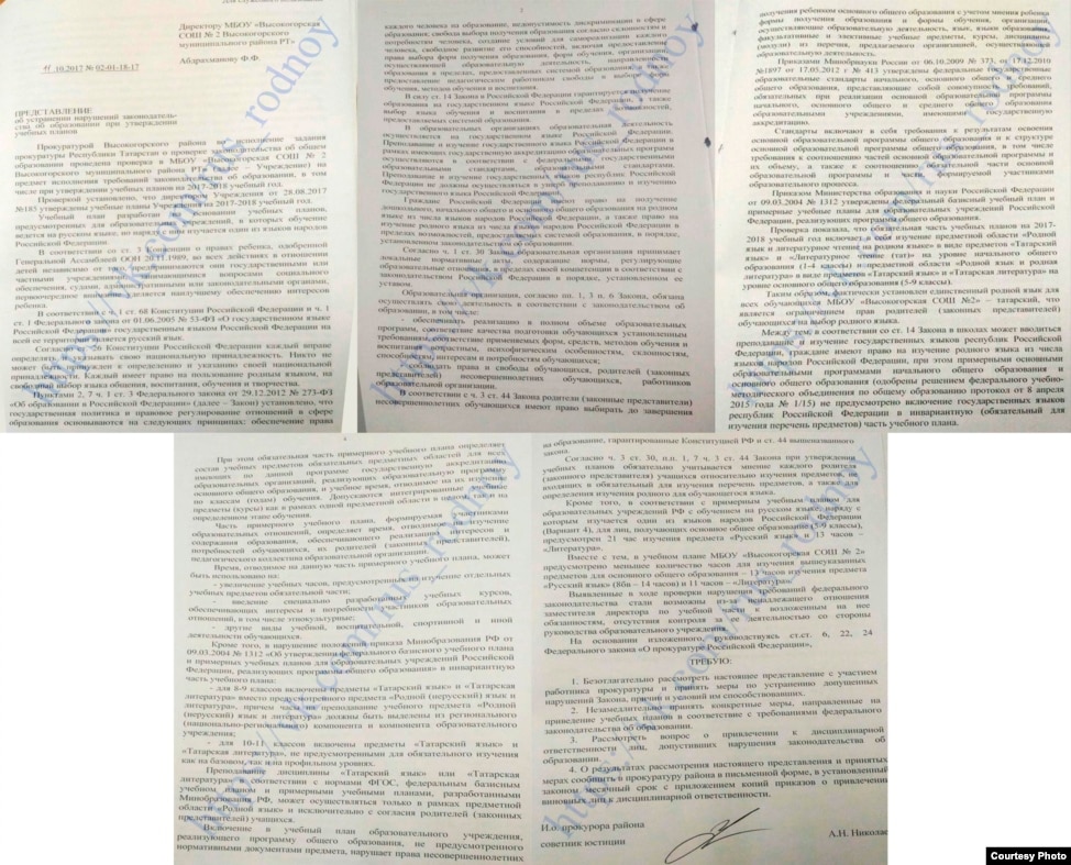 Потом появилось представление прокуратуры Советского района Казани, которая потребовала исключить татарский язык из обязательной программы в одной из школ столицы РТ. В нем также сказано, что проверка проведена "в рамках надзорной деятельности, по имеющейся информации и во исполнение поручения прокуратуры Татарстана от 25 сентября 2017 года №21-13-2017".