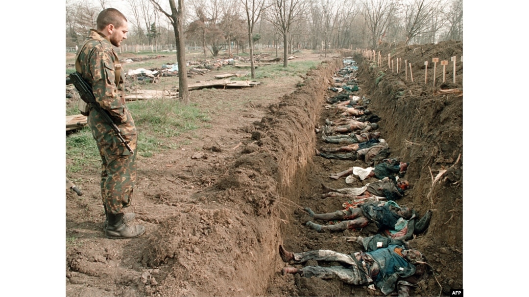Российский солдат осматривает тела мирных жителей, погибших в зимних боях, которые были эксгумированы для опознания на православном кладбище в Грозном, 31 марта 1995 года.